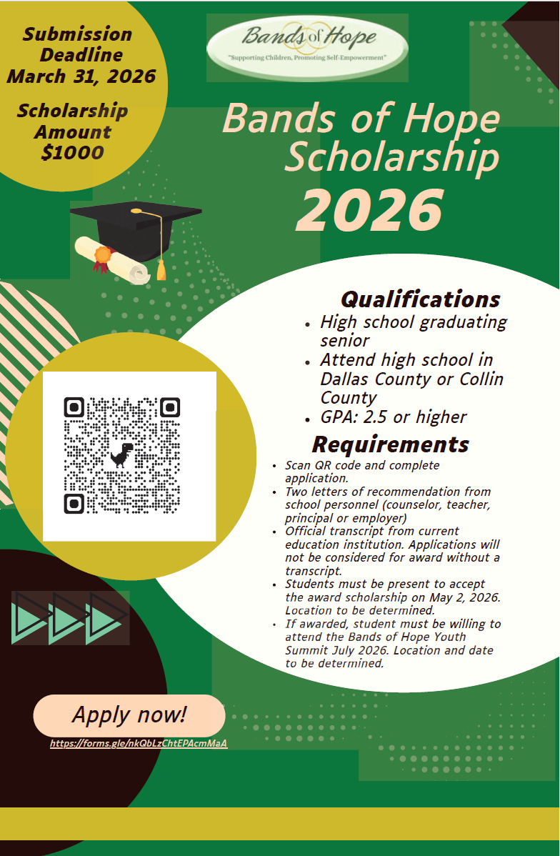 - If awarded, student must be willing to attend the Bands of Hope Youth Summit July 2026. Location and date to be determined.