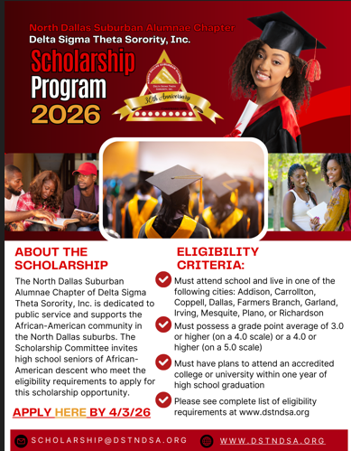 The North Dallas Suburban Alumnae Chapter of Delta Sigma Theta Sorority, Inc. (NDSA) is a public service organization dedicated to serving the North Dallas suburban area, with a special focus on the African American community. Each year, we offer scholarships to graduating high school seniors of African American descent.